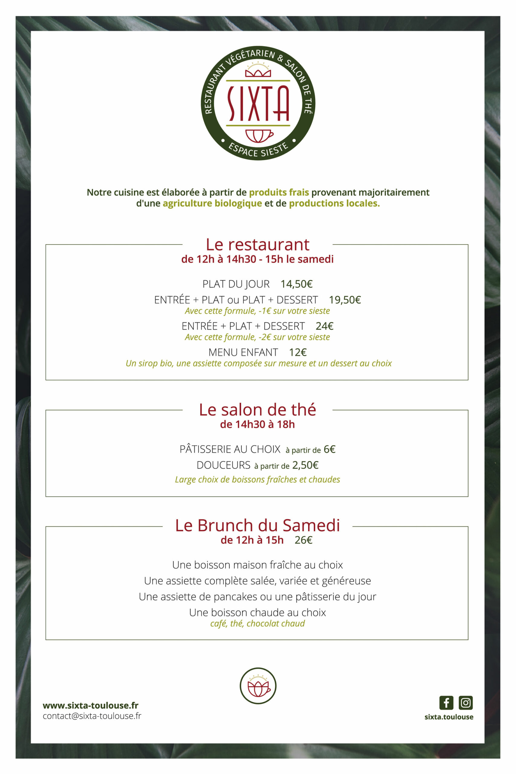 Les menus changent chaque semaine pour respecter au mieux la saisonnalité : 2 entrées, 3 plats et 5 desserts pour composer vos formules, avec une entrée de gamme à 14,50€ (plat unique), la formule entrée/plat/dessert étant à 24€ et permettant de bénéficier de 2€ de réduction sur la sieste de son choix. Découvrez notre formule BRUNCH du samedi à 26€.